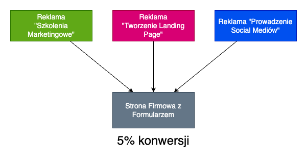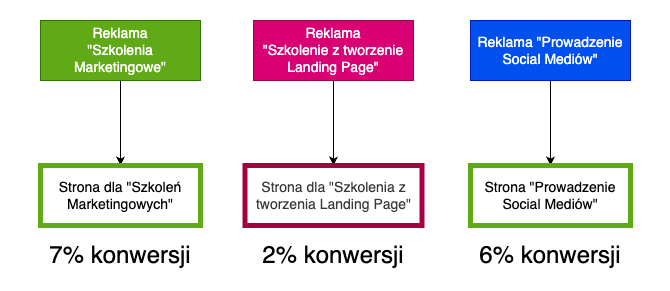Kampanie prowadzone w ten sposób nie wspierają realizacji konkretnego celu (którym jest pozyskanie leada na jedno ze szkoleń, które oferuje firma.). Strona ogólna organizacji dotyczy całej oferty, czyli jest mało skoncentrowana na konkretnym problemie. Widzimy, że konwertuje na leada w 5% – można to uznać za dobrym wynik, ale nie mamy prostej możliwości analizy tego, która ścieżka ruchu po kliknięciu w reklamę działa lepiej i na którym szkoleniu powinniśmy skupić się w najbliższym czasie. Zobaczmy jak może wyglądać podejście kierowania ruchu na landing page’e, które są spójne z komunikacją w reklamie: