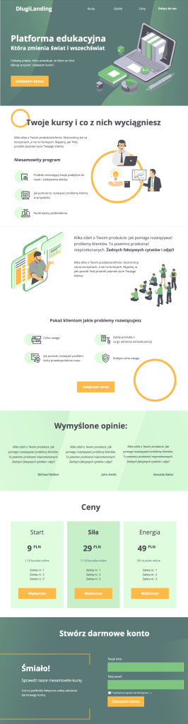 Long Form to typ landingu, który posiada znacznie więcej sekcji niż inne i dzięki temu przekazuje znacznie więcej informacji użytkownikowi. Na takim landing page’u mogą znaleźć się mocne nagłówki, cenniki, opinie, dłuższe formy tekstu itd. Tego typu strony mogą nawet rozważyć pozycjonowanie, więc warto się nad tym zastanowić. Dłuższa forma sprzyja zwiększeniu zaangażowania i zachęca do kliknięcia w CTA, niestety często kosztem zwiększenia jakości leada jest mniejsza konwersja. Warto sprawdzić czy użytkownik musząc przebrnąć przez długą forme twojego landing pagea nie odpada zbyt szybko. W sieci znajdziemy wiele szablonów landing które pokazują jak skutecznie stworzyć komunikacje teog typu.
