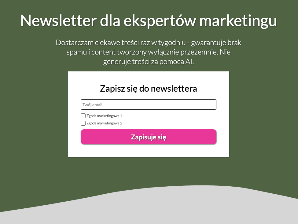Prosty landing pozwalający szybko zapisać się do newslettera. Często spotyka się z niezrozumieniem – bo przecież pobierając adres e-mail w pełnym formularzu (np. podczas wyceny lub zamawiania produktu) klient również ma możliwość zapisu do newslettera. W tym typie landingu chodzi jednak tylko i wyłącznie o skuteczność – kiedy zbieramy leady do bazy mailingowej, chcemy zrobić to tanio. Każde dodatkowe pole w landing pagu, każde rozproszenie powoduje spadki skuteczności -> czyli wzrost ceny leada.